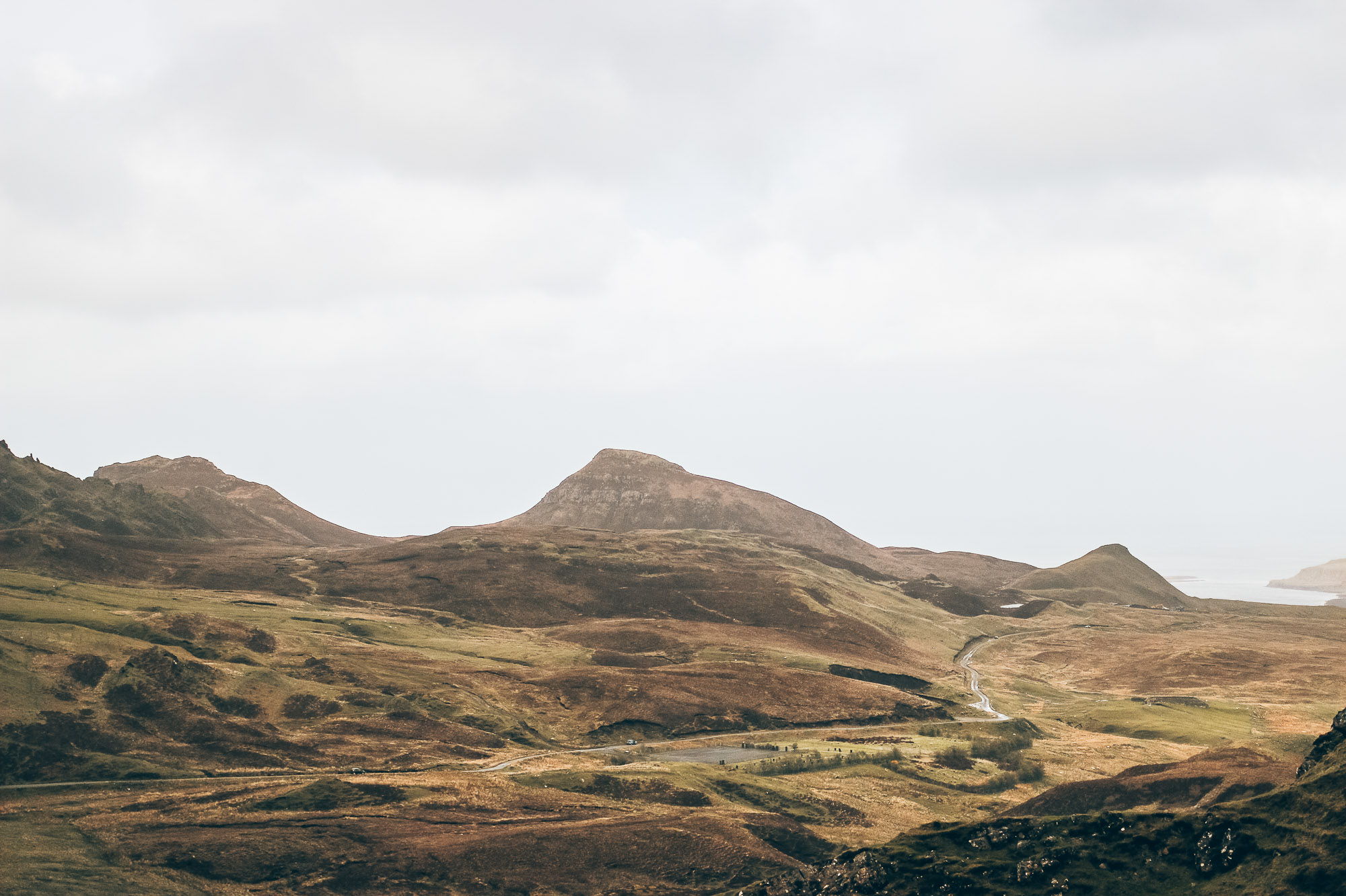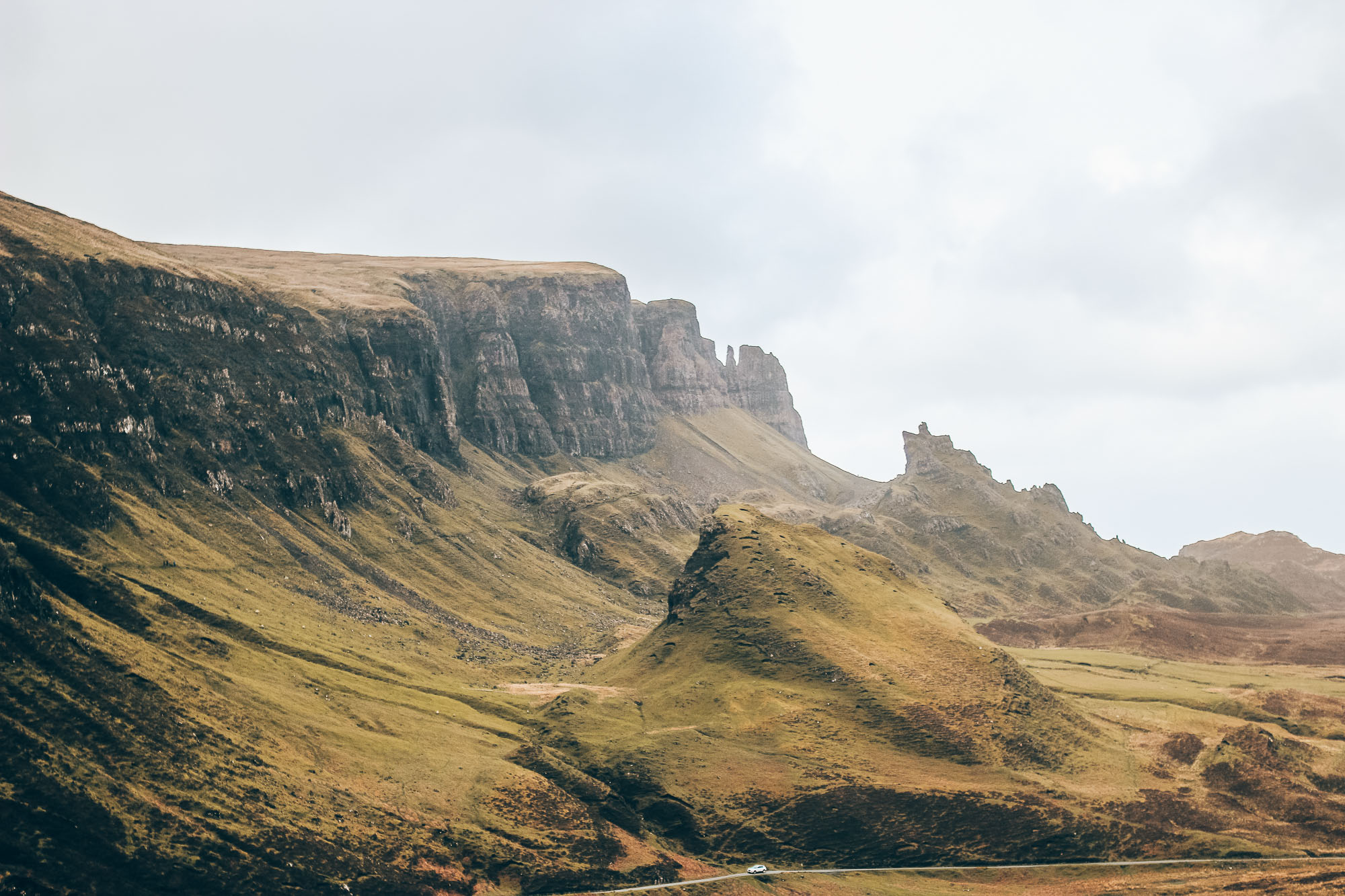 - On décide de finir notre journée par la randonnée Old man of Storr. Pour rejoindre le point de départ de la rando, le GPS intégré de la voiture nous fait passer par une route qui n’était pas sur Waze, une espèce de toute petite route qui traverse l’île d’Ouest en Est à travers les falaises. C’est une route étroite avec beaucoup de virages, mais les paysages sont juste sublimes ! Je vous conseille vraiment de passer par cette route : Quiraing road (c’est d’ailleurs là qu’est le point de départ de la fameuse rando Quiraing assez difficile il me semble, on ne la pas faite).