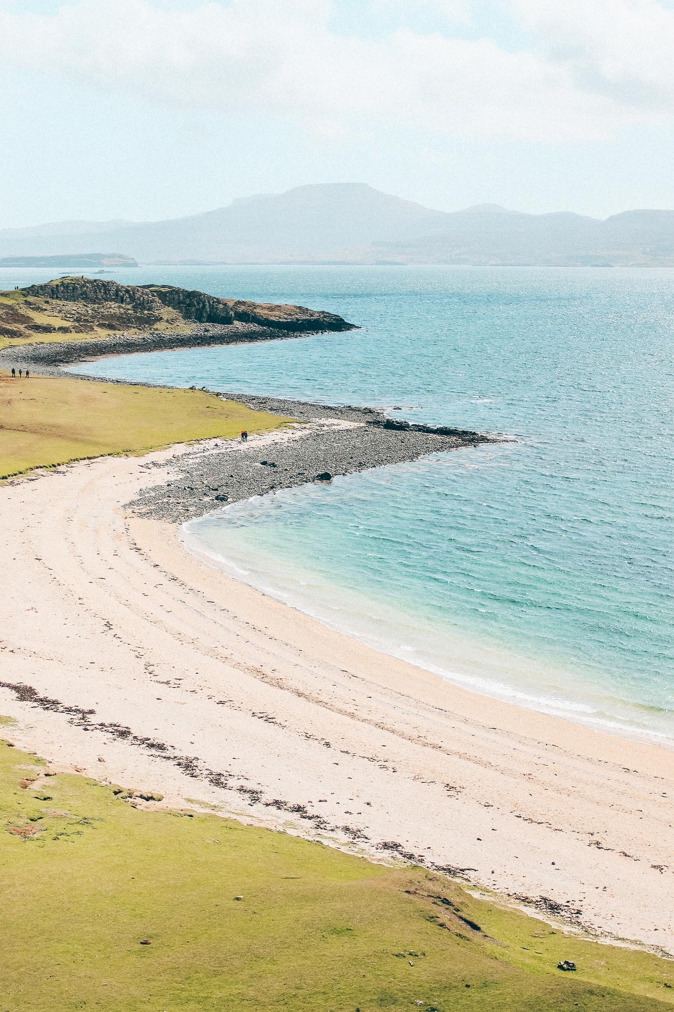 - Coral beach : petite balade après manger pour découvrir la seule plage de sable blanc et à l’eau turquoise sur l’île de Skye. Il faut compter 1h30 aller-retour après s’être garé au parking à Claigand. On était un peu septiques le long de la promenade, on se demandait comment c’était possible de trouver une plage de sable blanc ici, tant la roche est noire et l’eau foncée. Finalement, après une plage au sable noire typique d’Ecosse on arrive sur une plage de sable banc et eau turquoise, le contraste est vraiment impressionnant ! Photo ci-dessous.